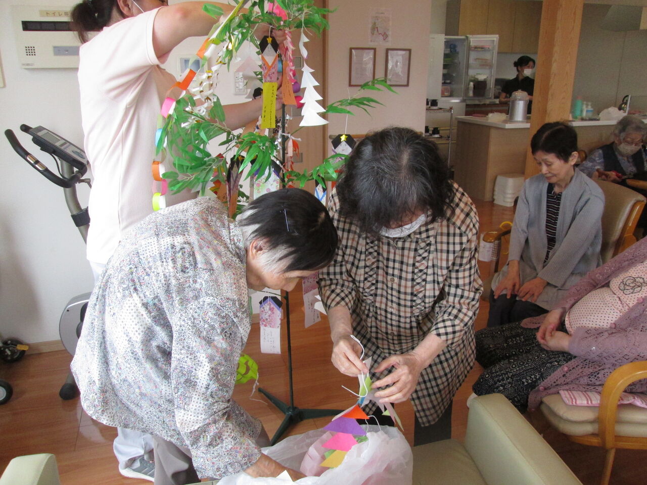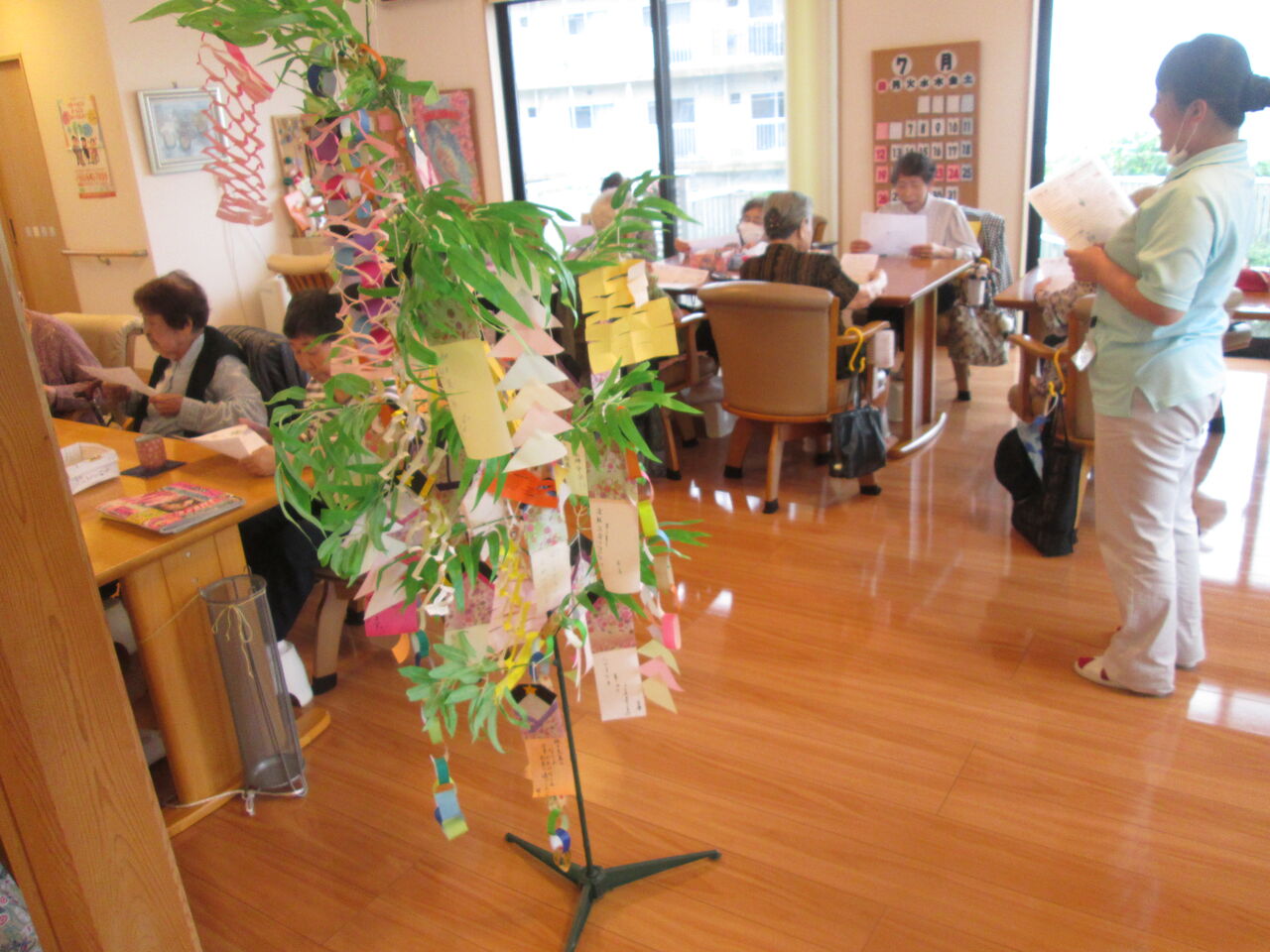 7月7日は七夕会を行いました。皆さんには織姫に見立てた短冊に願い事を書いていただき、笹への飾りつけもご利用者の皆さんと一緒に行いました!