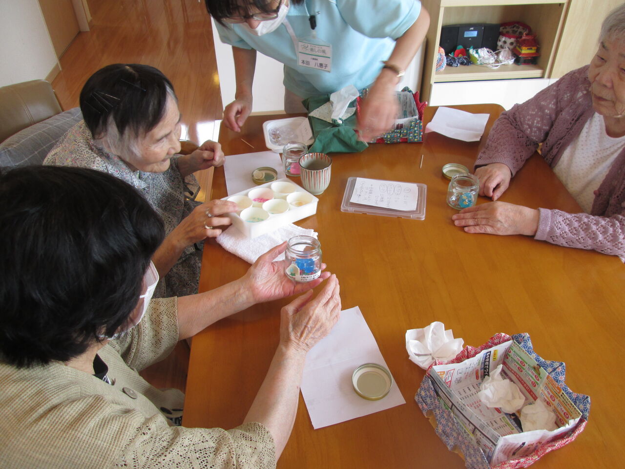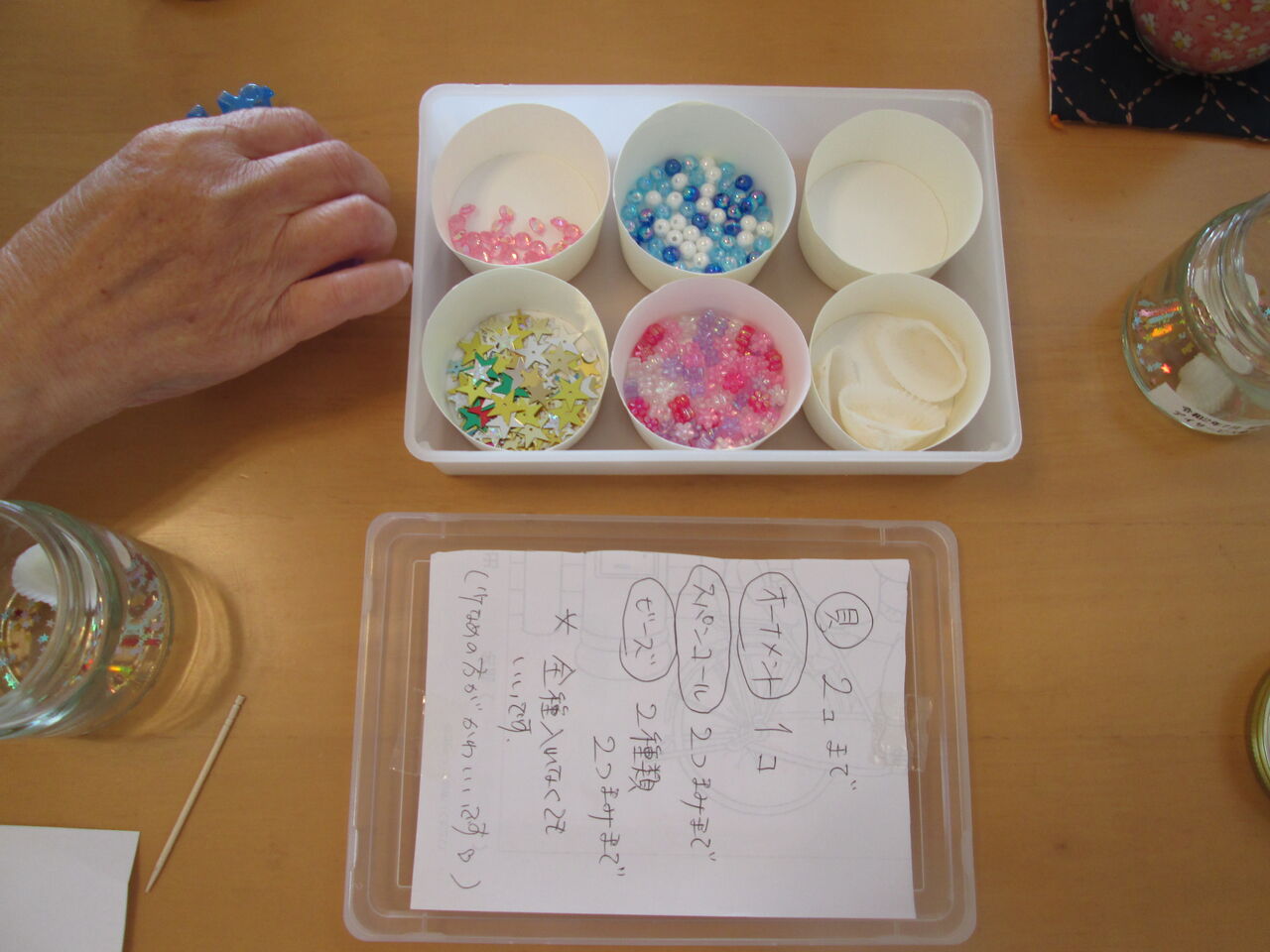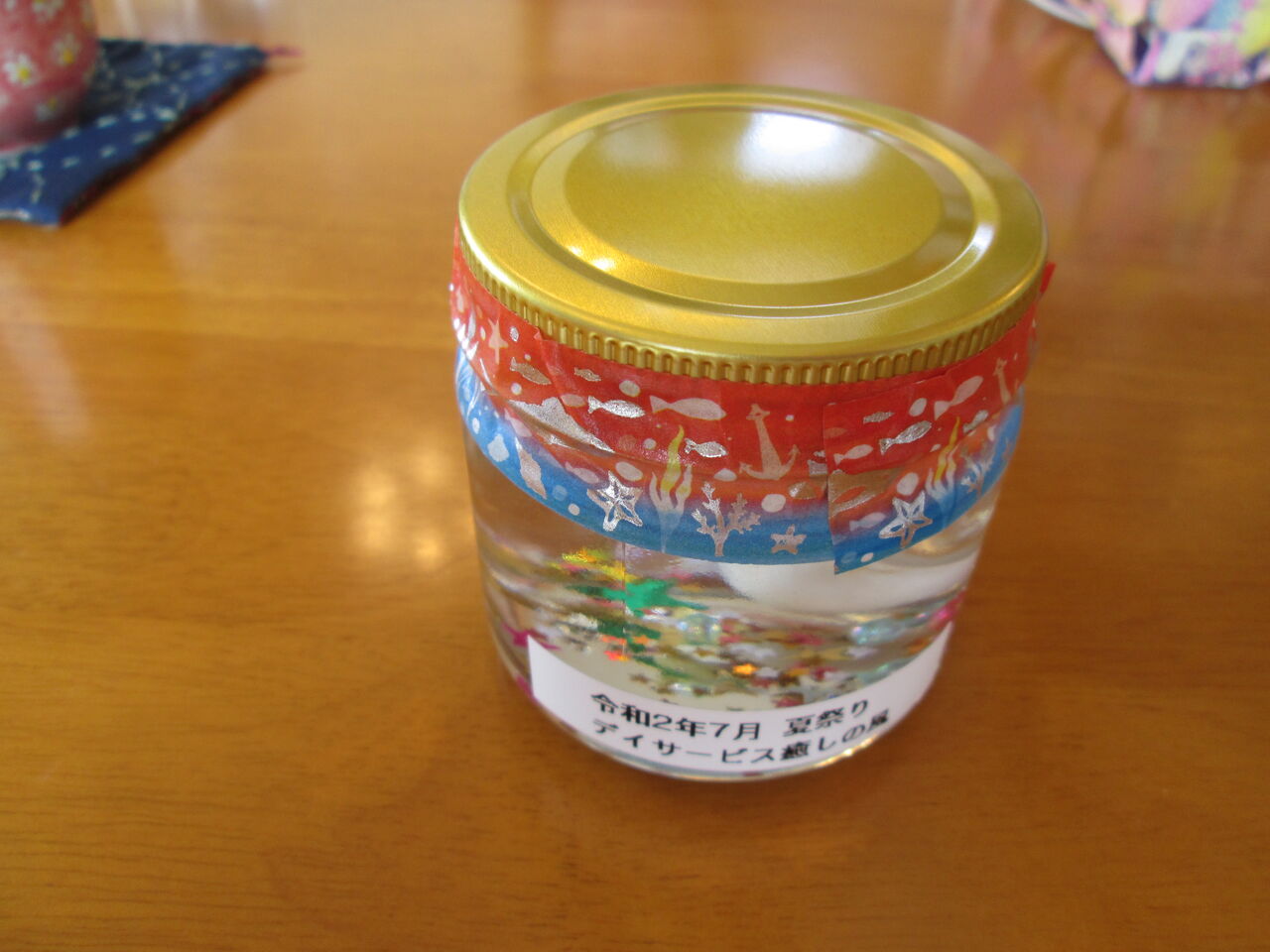 2020年8月31日 / 最終更新日時 : 2020年8月31日 dsiyashinokaze NEW 7月の行事(夏祭り) 7月20日から25日まで夏祭りを行いました。今年は新型コロナウイルス感染予防の為、毎年行っていた盆踊りや夏にちなんだゲームは中止し、夏祭りの記念品作り(スノードーム)を行いました! 夏祭り期間中の昼食メイン料理は、屋台風メニューのお好み焼き、たこ焼き、焼きそばの中からお好きな物を選んでいただき、おやつではアイスクリームを召し上がっていただきました! 記念品作りでは用意した瓶の中に、お好きな色のビーズや貝殻、夏らしい模型を入れ、みずのりと水を入れて飾りのシールを貼り付けて完成です! 夏らしくとても可愛い作品が完成し、皆さんとても喜ばれていました! 早速自宅玄関に飾っている方やご家族様へプレゼントされた方もおられ、今年の夏祭りを楽しまれた様でした! コメントを残す コメントをキャンセルメールアドレスが公開されることはありません。 ※ が付いている欄は必須項目ですコメント ※ 名前 ※ メール ※ サイト