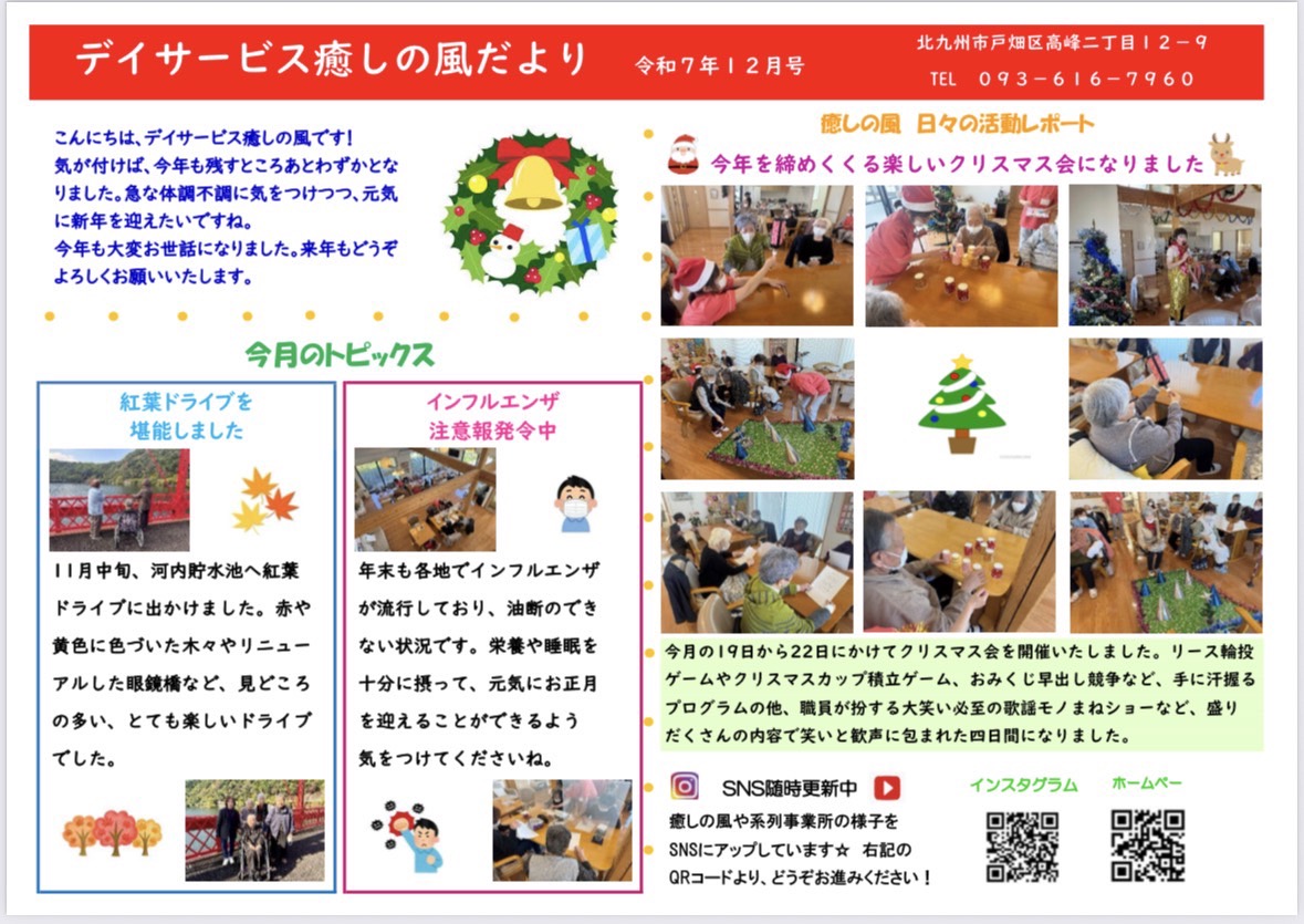 こんにちは!!デイサービス癒しの風です。「デイサービス癒しの風だより」令和7年12月号が発行されました。